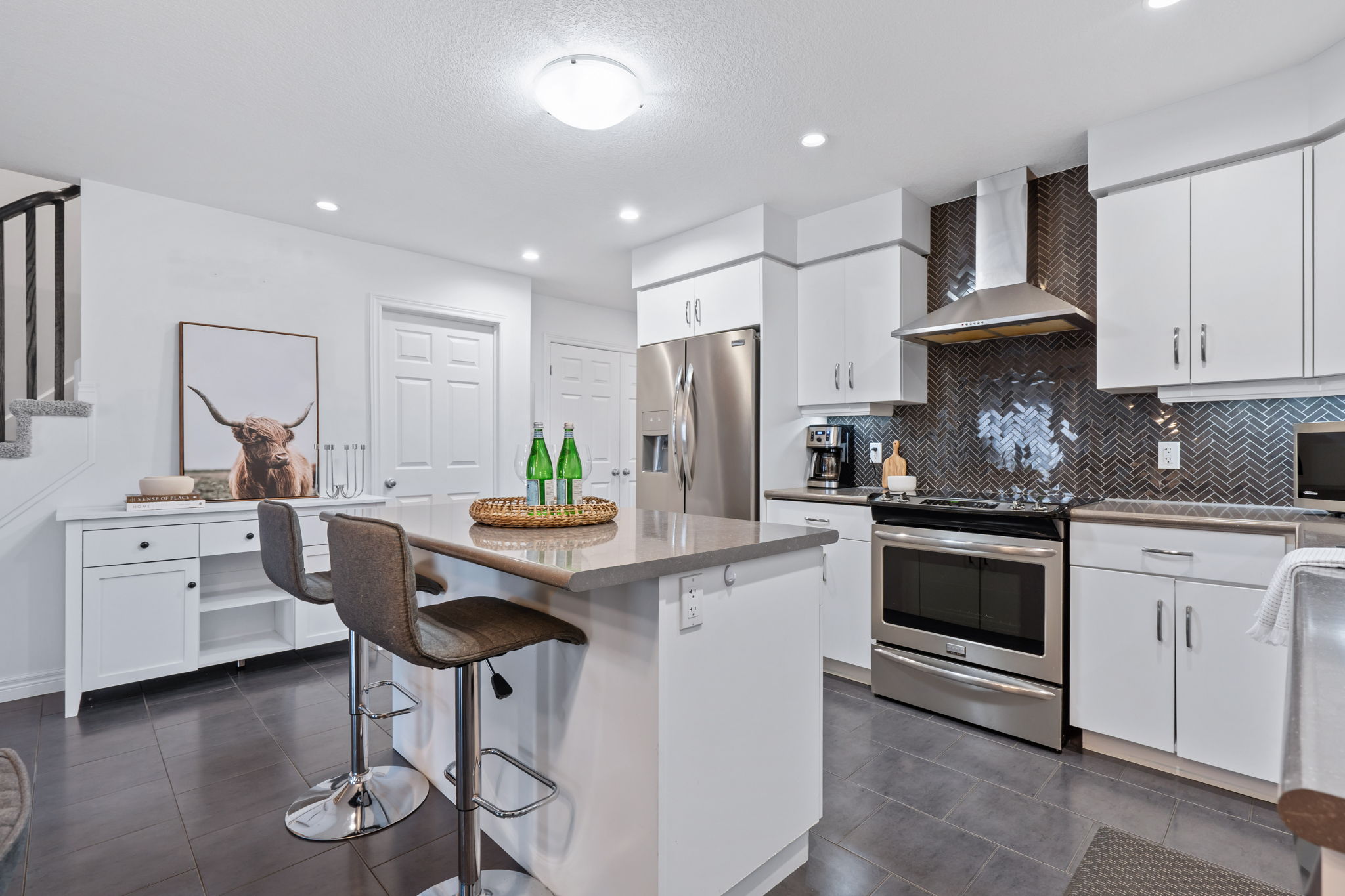 The kitchen and dining area shine with sleek quartz countertops and high-end stainless-steel appliances, providing both style and functionality. Designed with an open-concept layout, this West London Condo Townhouse features wide hallways, spacious living areas, and a generous kitchen island with an inviting eat-in dining space. Upstairs, the second floor is thoughtfully designed with three bedrooms, including a well-appointed primary suite with a luxurious ensuite bathroom. A four-piece bathroom and the added convenience of an upstairs laundry complete the second level, enhancing the home’s practicality.